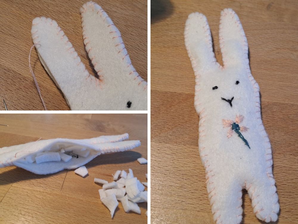 Legt nun beide Hasenteile aufeinander und nehmt einen passenden Stickfaden oder etwas dickeres Nähgarn. Ich habe mich für leichtes rosa entschieden, weil ich damit auch die Blüte gestickt habe. Die Naht kann man ruhig sehen, die gehört zur Deko des Häschens. Rundherum wird die Hasenfigur nun geschlossen.