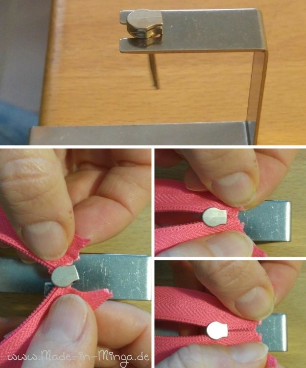 Ein Gerät, was den Zipper des Reißverschlusses beim Einfädeln festhält