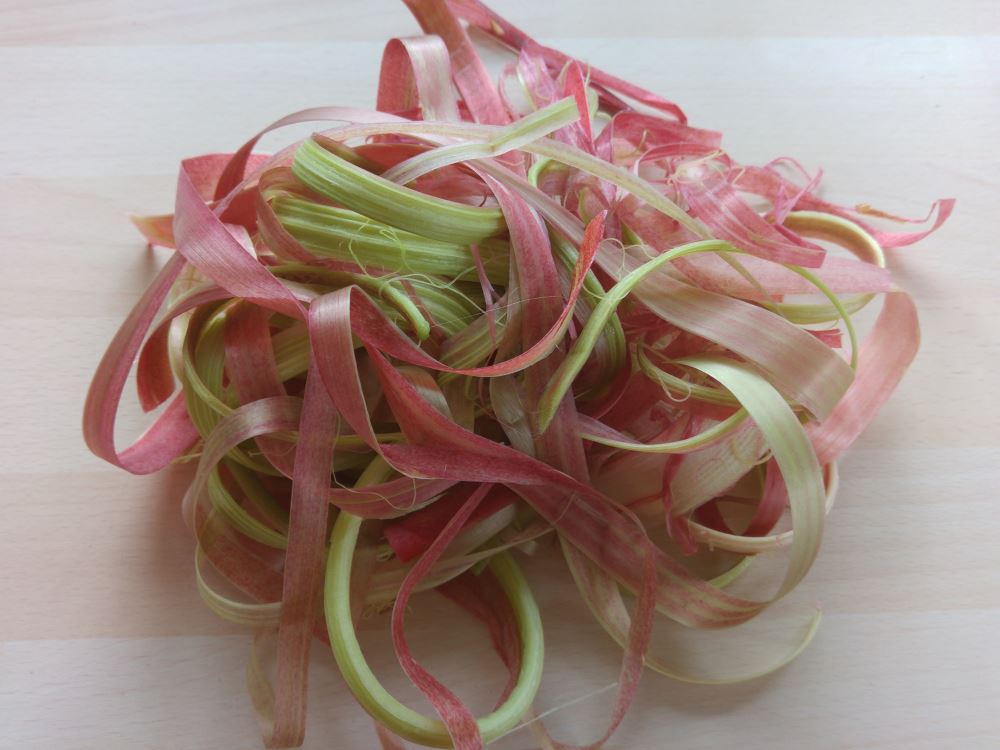 Den Rhabarber mit einem kleinen spitzen Messer schälen. Aus Erfahrung kann ich nun auch mitteilen, dass dieser Schritt nicht mit einem Gemüseschäler zu machen ist, da Rhabarber unfassbar fies und rot spritzt… also, bitte keine weiße Bluse tragen beim Backen. 🙂