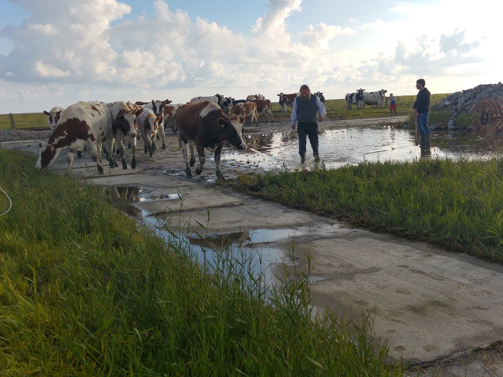 Zudem, Anweisung mit Nachdruck: Unter allen Umständen vermeiden, dass die Kühe nach Norden ausbrechen. Sie würden ins tiefe Wasser laufen und ertrinken. Wenn wir umfallen, würden wir höchstens dreckig. Die Kuh jedoch muß in der Herde bleiben. Oops… ich hatte gedacht, die bleiben sowieso in ihrer Herde. Warum sollten wir umfallen und die Kühe ertrinken? Ich malte mir sofort alles in den düstersten Farben aus. Was für eine Verantwortung! Weder wollte ich von einer Kuh umgeschubst werden, noch sollte eine ertrinken, weil ich im Watt stecken bleibe… aber, es war keine Zeit mehr, nachzudenken (zum Glück). Die Ebbe war da, wir ergriffen unsere Stöcker und marschierten zum Feld.