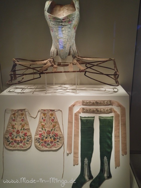 Aus der Waffenabteilung hab ich Euch keine Bilder mitgebracht, weil mich auch der engagierte Kurator hier nicht mitreißen konnte. Ich bin einfach kein Waffen- und Jagdfan. Danach jedoch kam die „Kleiderkammer“, und da war ich wieder dabei. Allein diese Vitrine war schon toll. Ein Schnürkorsett mit Reifrock-Unterbau wird hier gezeigt. Darunter links die Taschen, die da hinein geknotet werden, damit Frau auch alles mitschleppen kann, was so gebraucht wird. Rechts die Strümpfe und die Strumpfbänder. Das Gerüst für den Rock hat übrigens ein Scharnier – wenn es mal eng wurde, klappte die Dame ihr Rock einfach hoch… schon irgendwie cool, oder?